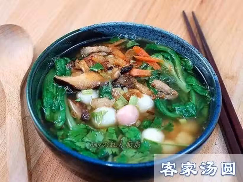 材料:湯圓500g,五花肉100g,香菇5朵,蝦米適量,紅蔥頭5瓣,蔥2根,芹菜少許,茼蒿適量,香菜少許,胡蘿蔔少許,醬油1小匙,鹽1小匙,芝麻香油少許,胡椒粉少許,高湯600cc