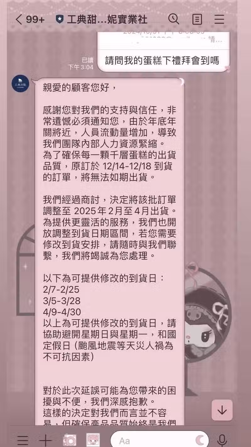 也陸續有消費者發文指控,提前幾個月預訂的蛋糕卻在前一天才被告知「做不出來」,店家甚至宣稱要延到明年2月才能出貨,在網絡上引發許多消費者PO文炮轟。