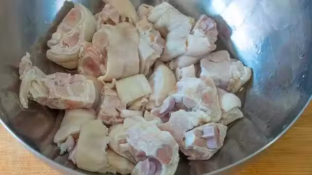 1、豬蹄1斤,清洗乾淨後剁成小塊兒。豬腳不太好剁,可以買的時候讓店家幫忙剁好,回來後就可以直接煮了。