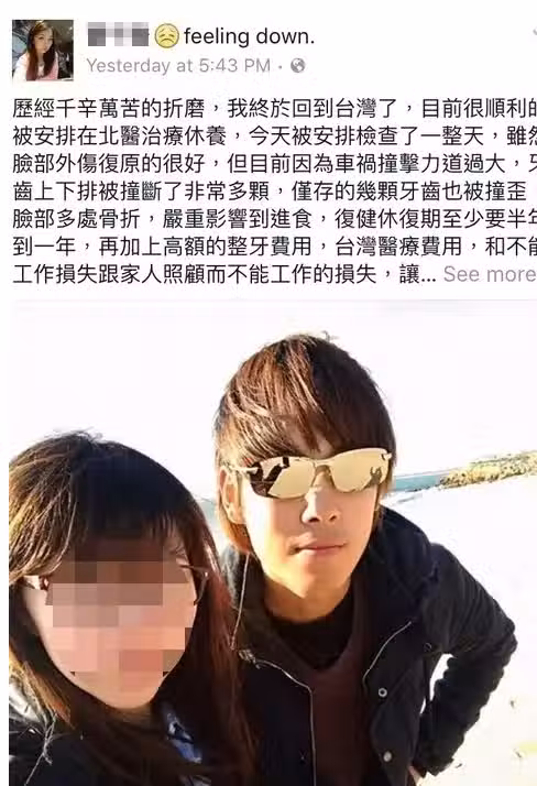 復健休復期至少要半年到一年,再加上高額的整牙費用,台灣醫療費用,和不能工作損失跟家人照顧而不能工作的損失,讓我非常煩惱。