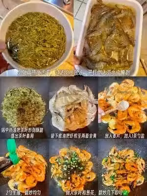3⃣起鍋熱油把茶葉炸至酥脆,撈出茶葉,用底油把蝦煎至兩面焦黃,加適量鹽和生抽調味