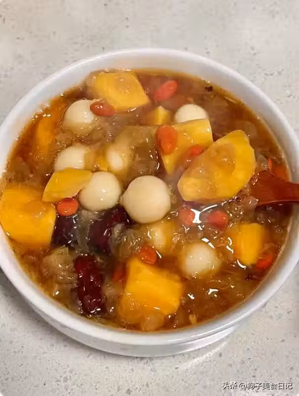 材料:一根紅薯,4個紅棗,適量銀耳,一小把枸杞,適量糯米丸子,2塊紅糖。