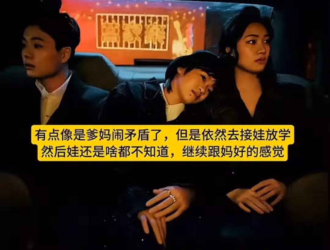 玩梗的網友,乾脆配上台詞,有點像是爹媽鬧矛盾了,但是依然去接娃放學,然後娃還是啥都不知道,繼續跟媽媽好的感覺。