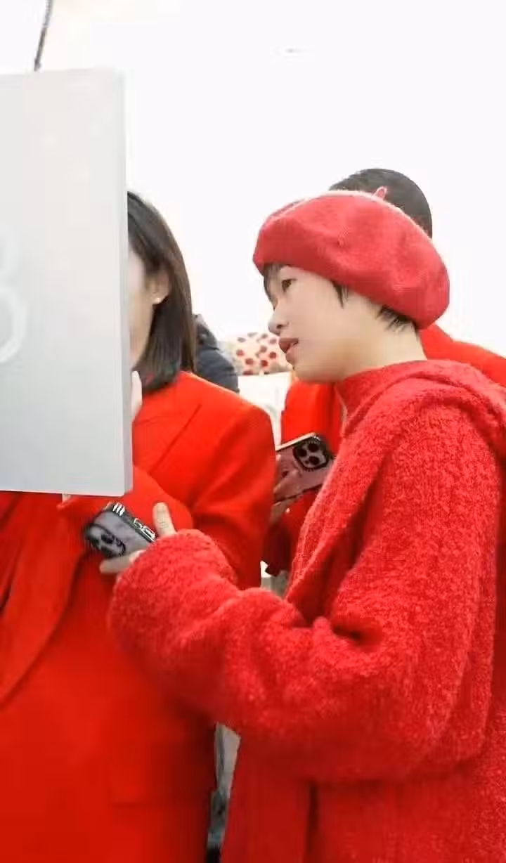 全紅嬋一身紅色毛衣格外喜慶,搭配同色系的妝容,更是可愛極了。