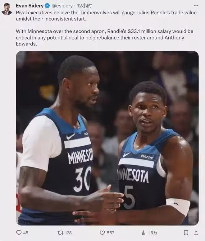 12月25日,據NBA記者Evan Sidery報道,其他球隊的高管認為,森林狼會評估蘭德爾的交易價值。森林狼的薪資已經超過第二土豪線,蘭德爾本賽季薪水3310萬美元。送走他之後,能幫助森林狼圍繞愛德華茲打造更平衡的陣容。