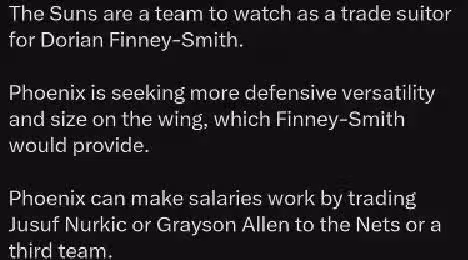 史密斯身高2米01,本賽季至今場均10.8分4.3板1.6助,場均以45.2%命中率扔進2.5記三分球,年薪1439萬美元,太陽可以直接用努爾基奇(1813萬美元)或阿倫(1563萬美元)對他薪資匹配。