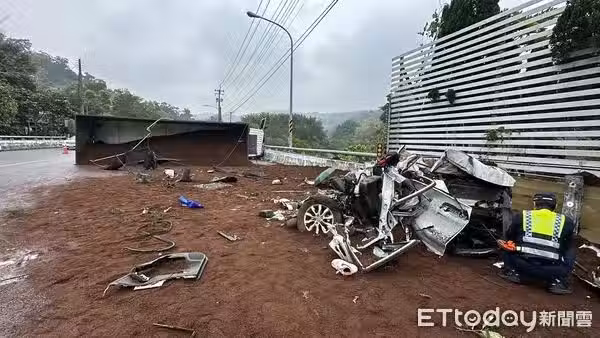 當時一輛超載的肥料聯結車,準備在下坡轉彎時,突然失控翻覆,整台聯結車直接壓扁一輛休旅車,當時在車內的一對母子遭殃,釀成一死一重傷的悲劇。