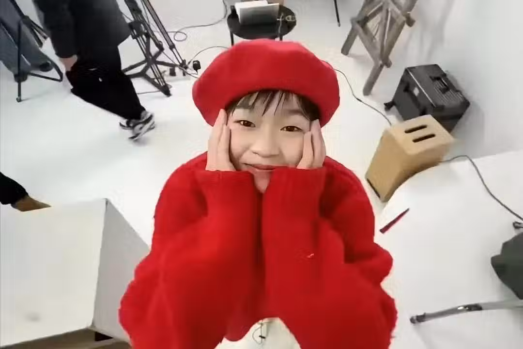 在拍攝花絮中,全紅嬋穿紅色毛衣、帶著紅色貝雷帽,雙手捂著臉、俏皮又可愛。