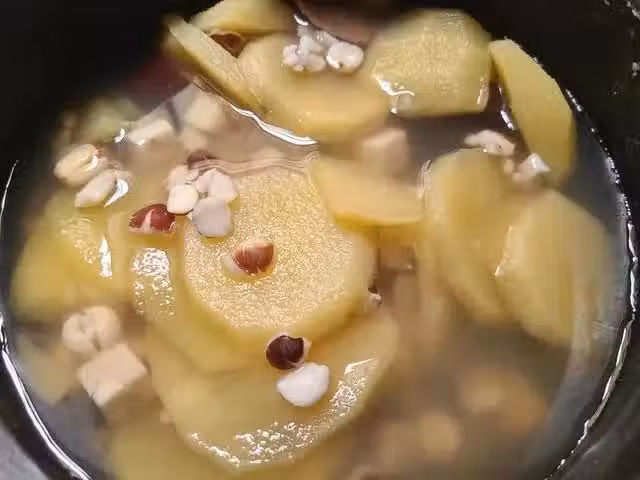 食材:蘋果兩個、芡實和茯苓各 15 克、懷山和蓮子各 10 克、紅棗一大顆
