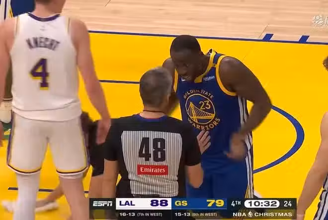 此時眼看對方兩個人卡住了自己的籃板球位置,格林為了搶板直接用出了一個全新招數,他從下面往上摟起胳膊,一舉摟住了克內克特和八村塁兩人的胳膊,用了一個夾臂的動作,一個人夾住對方雙人手臂,直接把湖人二將放倒在地。