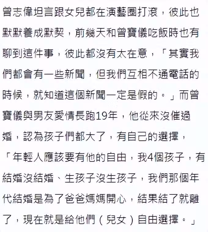 曾寶儀與大學初戀交往19年不結婚不生育,也有說是被曾志偉的感情經歷影響,曾志偉受訪表示自己沒有催過婚,讓孩子們自己選擇,他的四個孩子,有的結婚,有的沒結婚,有的生小孩,也有沒生小孩的,他不會管,還說自己結婚是為了爸爸媽媽開心,結果馬上就離婚了。