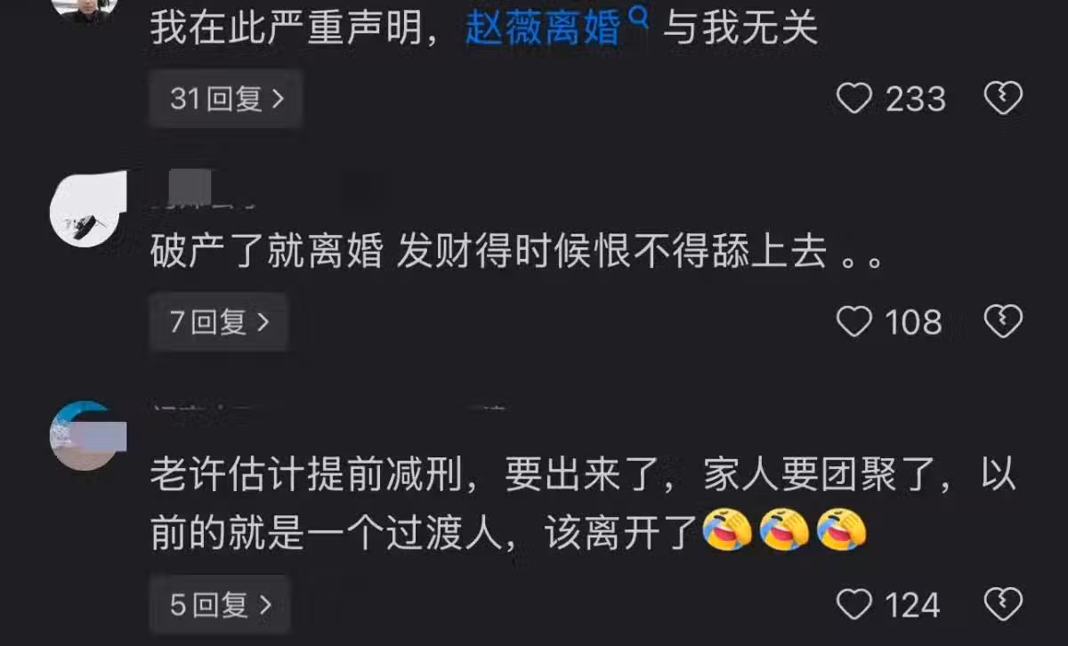還有網友表示,這樣的離婚是不是「戰術性」或者「戰略性」離婚?也有網友認為,有錢人的套路我們是不懂的,多年前消失不見,這會兒又出來露頭,難道事兒擺平了?更有網友質疑,雖然名義上離婚了,說不定倆人私底下天天在一起。