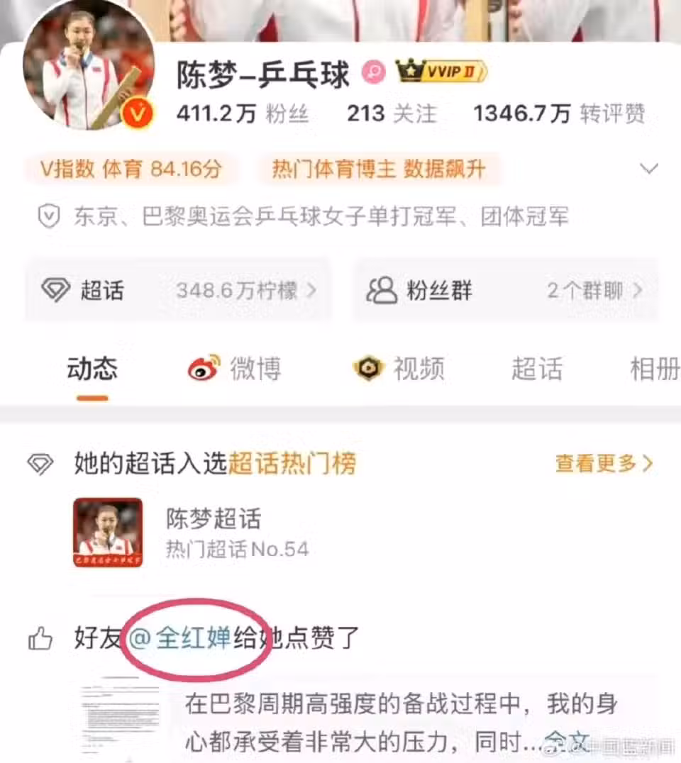 而在陳夢發文之後,奧運跳水冠軍全紅嬋隨即給她點贊。在樊振東發文之後,奧運游泳冠軍潘展樂也給他點贊。
