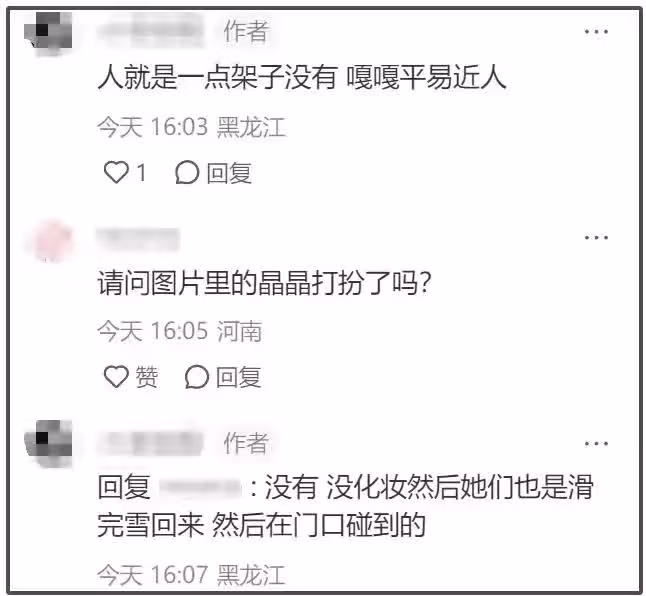 據路人描述郭晶晶這次似乎是一家人出來旅行,之前也有網友偶遇霍啟剛和郭晶晶在哈爾濱帶娃遊玩的畫面。一家人出行非常低調,在氣溫比較低的冰雪大世界,郭晶晶一家人的穿搭也是以保暖實用為主,穿著羽絨服和路人拍合照,和放假帶娃的普通家長沒什麼區別。