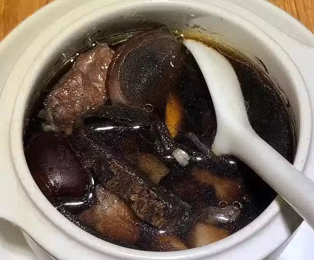2、黑豆提前浸泡2 - 3小時,枸杞、紅棗洗凈,肉類洗凈切塊,焯水撈出。將所有材料放入湯鍋中,加入足量清水,隔水燉2 小時,加鹽調味即可。