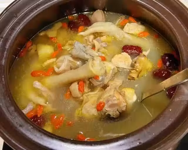 3、小火燉一個小時左右,燉好後,湯麵上可能會有一層油,用勺子刮掉,這樣喝起來不會太油膩。然後加點鹽調味,不要太多,保持雞湯的原汁原味。最後撒上一把枸杞,再蓋上蓋子燜個十分鐘,讓枸杞的營養也融入到湯里。