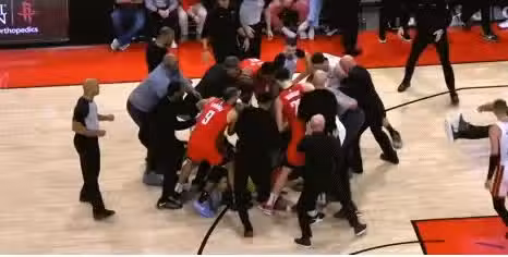 火箭隊和熱火隊的比賽進行到第4節的時候,雙方突然爆發了大規模衝突。火箭隊的球員阿門湯普森和熱火隊的球員希羅首先兩個人在一起開始抱摔,隨後雙方的球員馬上加入混戰,現場也是亂作一團,此時現場的安保人員以及教練團隊全都殺入,到中場位置加入戰團,就連一名助理教練都直接被掀翻在地,