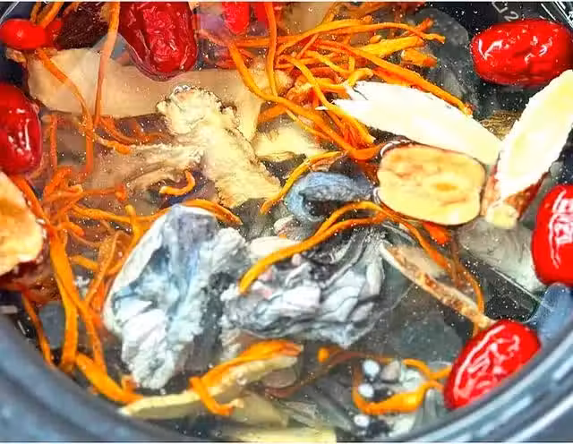3、把準備好的烏雞、紅棗、玉竹、蟲草花、麥冬、當歸、黃芪、枸杞一起放入砂鍋里。加入適量的清水煮沸,大火煮沸轉小火煲煮90分鐘,下入少許鹽調味即可。