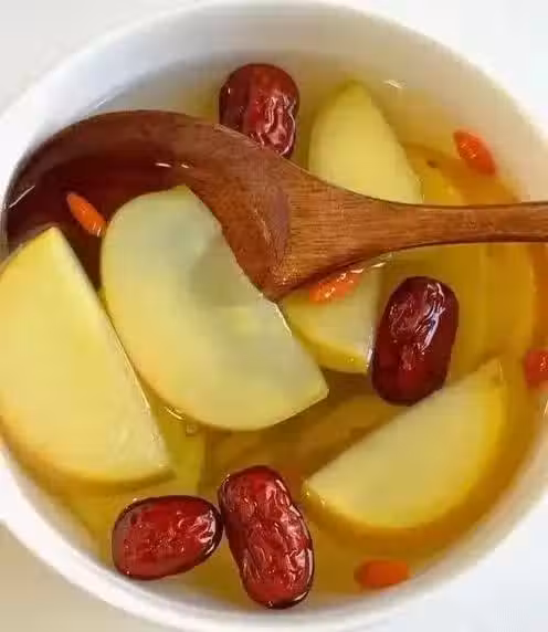 1、蘋果半個洗凈切小塊,紅棗5顆、冰糖3塊、枸杞5g,放入養生壺,加水煮20分鐘。