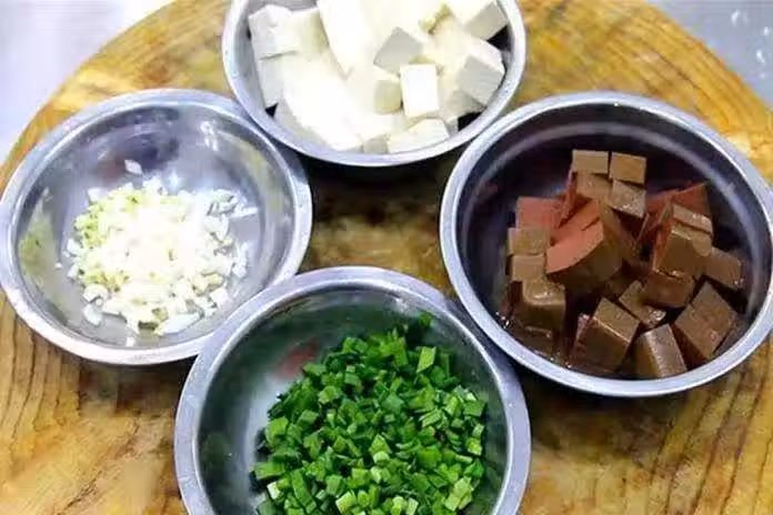 1.準備一塊嫩豆腐、切成方丁;豬血一塊,也切成同樣的方丁;大蒜拍扁、切成碎末,大蔥破開、切成蔥花,另外切一點韭菜花備用。
