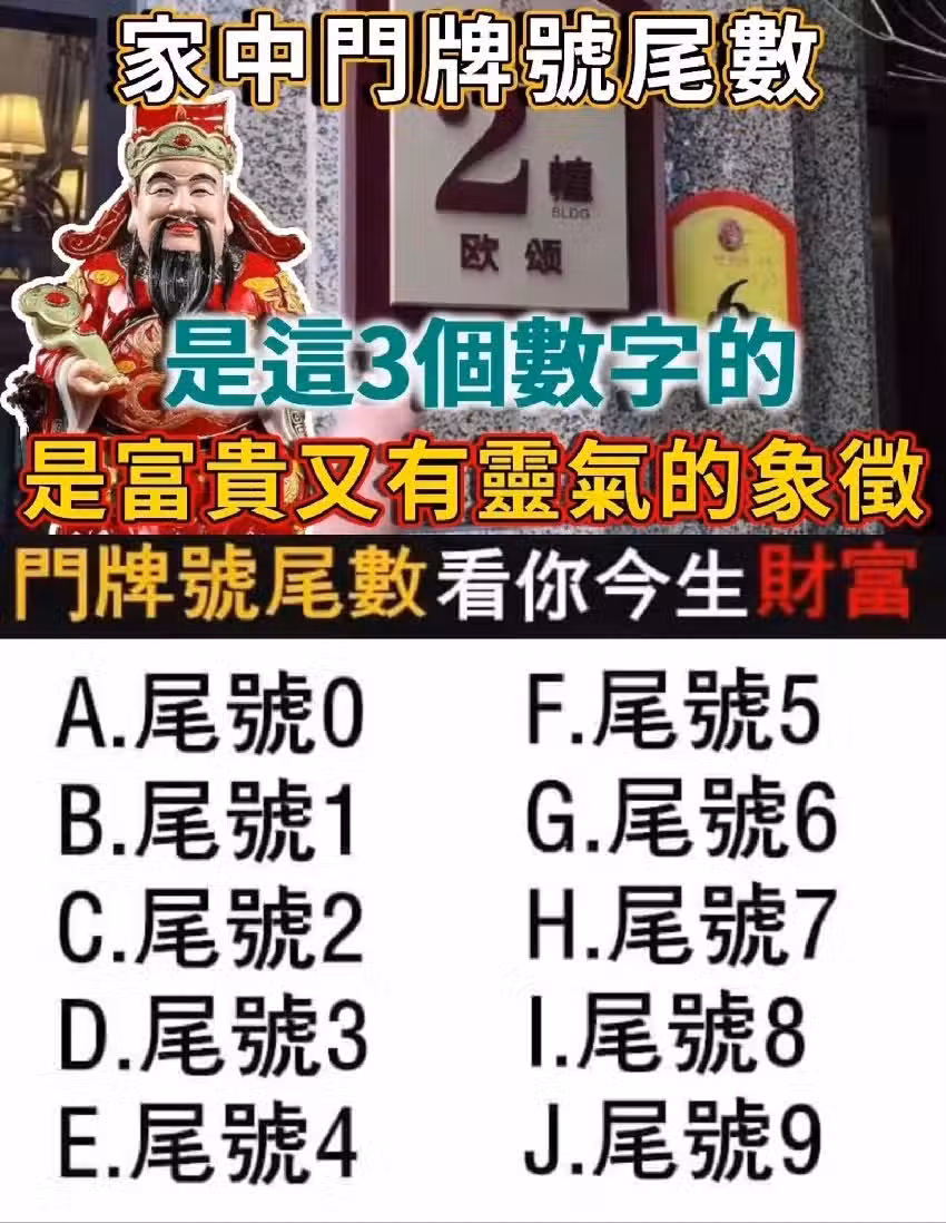 戶門適宜朝東北、朝北、朝西、朝東南,樓層或門牌號碼尾數適宜是1、6、7、9。