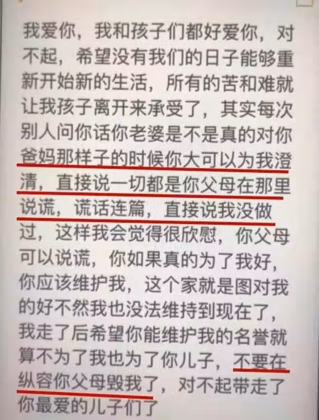 在出事的前一天,她在社群平台上留下兩封遺書。一封給丈夫,另一封給自己的姐姐。在信中,她痛心地寫道:「如果你真的為我好,你應該維護我,即使不為了我,也為了你的兒子們。」這句話字字血淚,顯示她在婚姻中感受到的孤立無援。