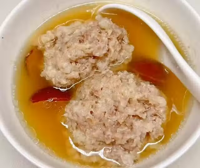 2、碗里放兩片姜,把肉餡團成丸子形狀,放2顆去核紅棗,加適量的涼白開水,水開上鍋蒸20-30分鐘(看肉丸大小決定時間)