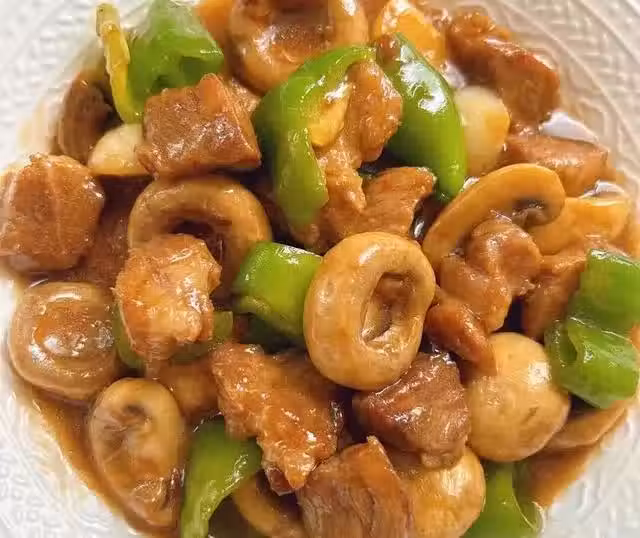 3、油熱爆香肉粒,煎至兩面金黃,爆香蒜粒,加入口蘑煎,倒入料汁燜煮5分鐘,加入青椒塊,大火收汁