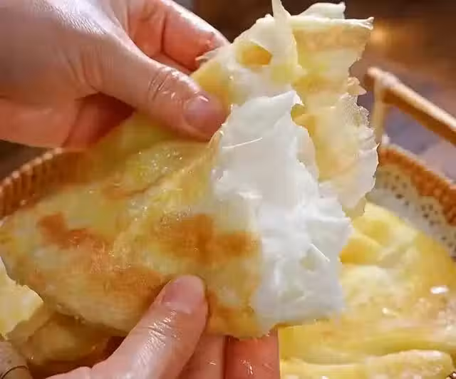 6、把卷好的餅稍微按一下,放鬆鬆弛10分鐘。擀好後,可以開始烙餅了。預熱一個平底鍋,加入適量的油。把擀好的麵餅放入鍋中,用中小火慢慢烙。第一面烙定型後,刷上一層油,再翻面繼續烙。每一面都烙至金黃,外面鼓起來就可以了。
