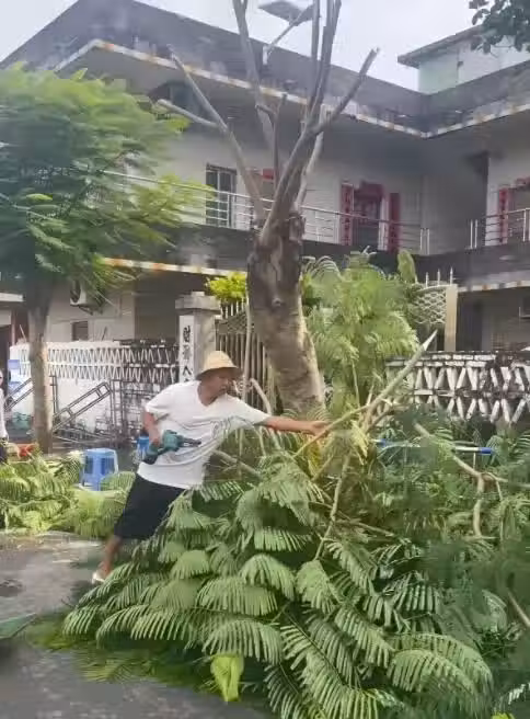在颱風到來之際,竟然親自上手把樹的枝幹都給砍掉了。