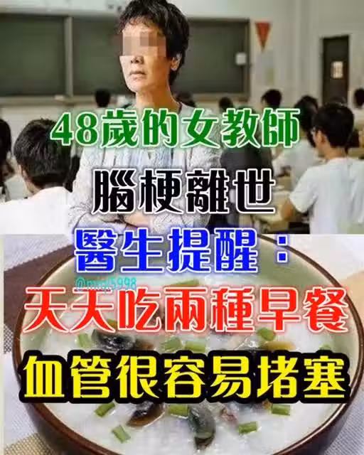 48歲女教師腦梗離世,醫生 :天天吃2種早餐 ,血管很容易堵塞!再不知道就晚了!