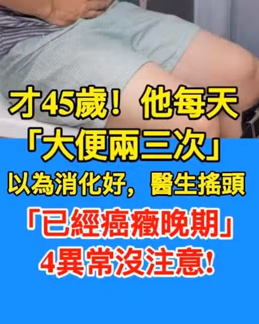才45歲!他每天「大便兩三次」以為消化好,醫生搖頭「已經癌症晚期」,4個異常沒注意
