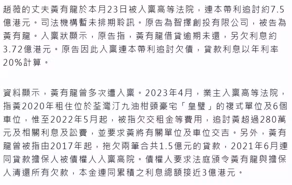 趙薇這則聲明十分溫和,沒有譴責任何人,也沒有用律師函的形式否認外界傳聞,看來演藝事業的停滯讓她的心態發生了轉變。之所以選擇現在發聲明,很大原因是黃有龍最近又被催債了,涉及7.53億港幣,摺合新台幣31.8億,如果趙薇不發聲明,外界都會以「趙薇丈夫」稱呼黃有龍,債主也會因為兩人是夫妻而向趙薇追債。