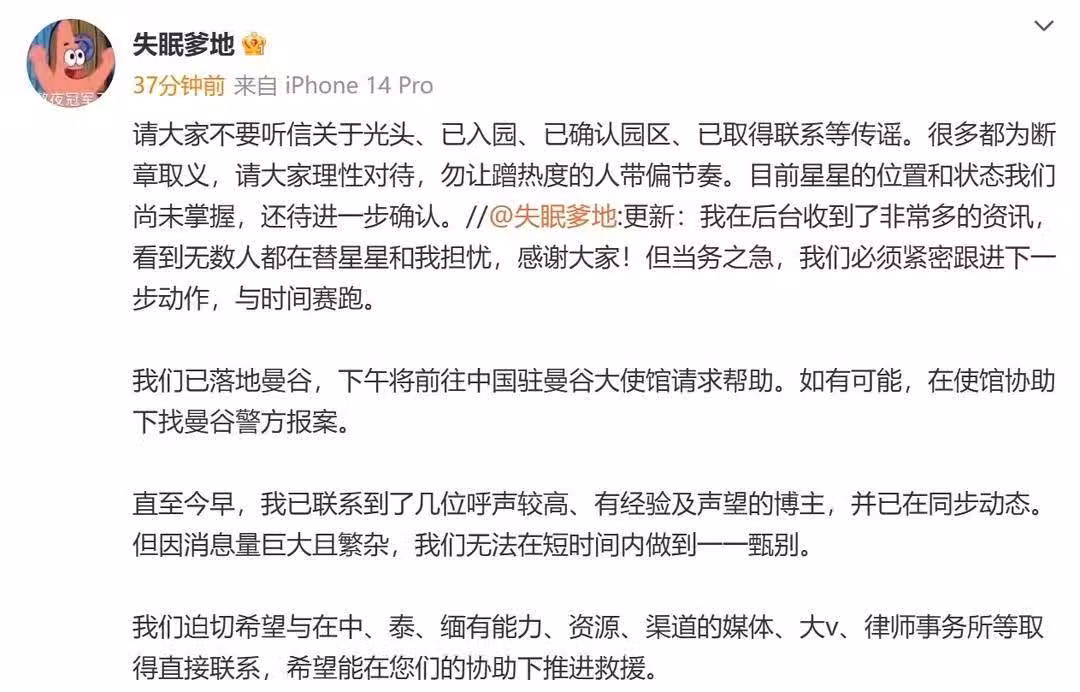 中國駐泰國大使館6日表示,駐泰國使館和駐清邁總領館已收到當事人家屬求助,正與泰國有關方面及家屬密切溝通,積極提供必要的協助,全力查找當事人下落。