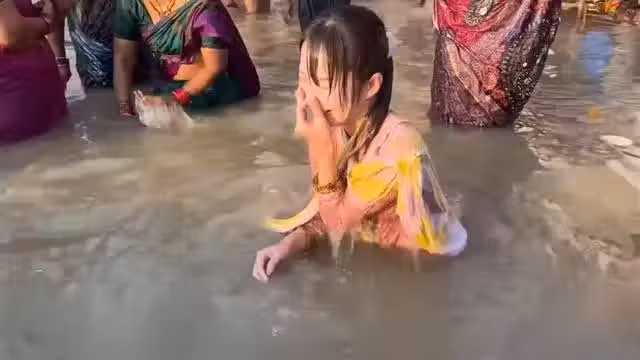 一早6點,她穿著印度傳統服飾,脫下鞋子,效仿當地人的樣子緩緩走入恆河,面對太陽雙手合一。