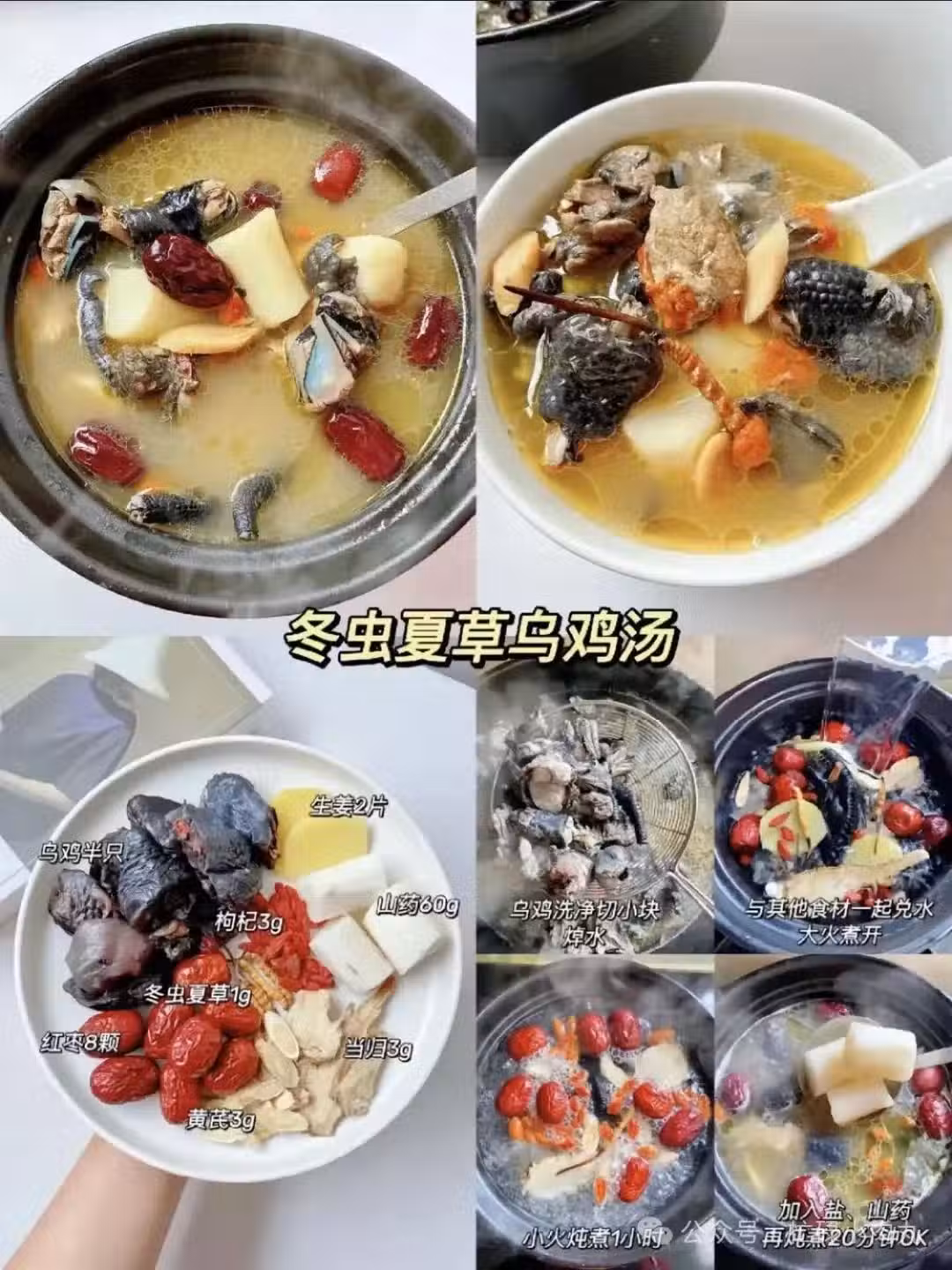 3⃣️紅參北芪燉雞湯 匯聚了多種滋補好物。紅參帶著獨特的甘味,北芪散發淡淡藥香,與鮮嫩烏雞共入一鍋。小火慢燉間,食材精華漸漸融於湯中。喝上一口,能品到烏雞的鮮美、紅參的醇厚和北芪的清新,多種滋味混合。這湯補氣血、益元氣,簡單質樸的味道里藏著養生的奧秘,讓家人在日常飲食中收穫健康。