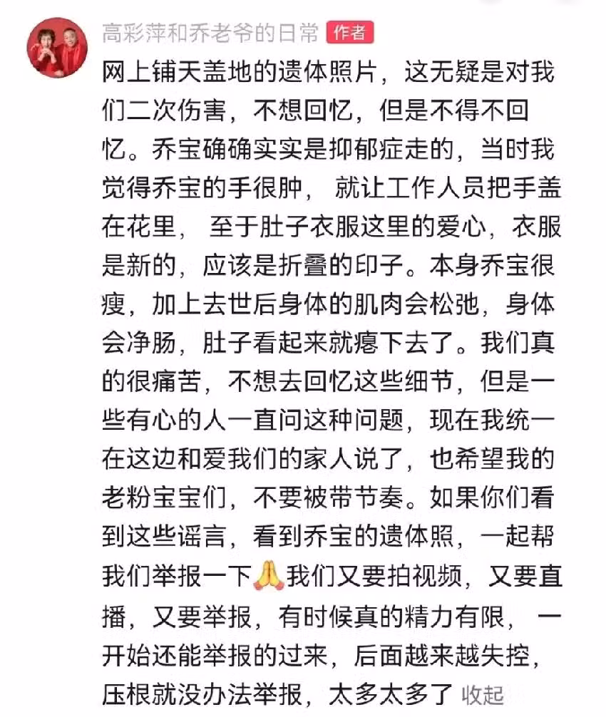 兩老期盼外界不要再散布喬任梁的遺體照,希望網友幫忙看到謠言或照片就立刻檢舉,不然場面可能會越來越失控。