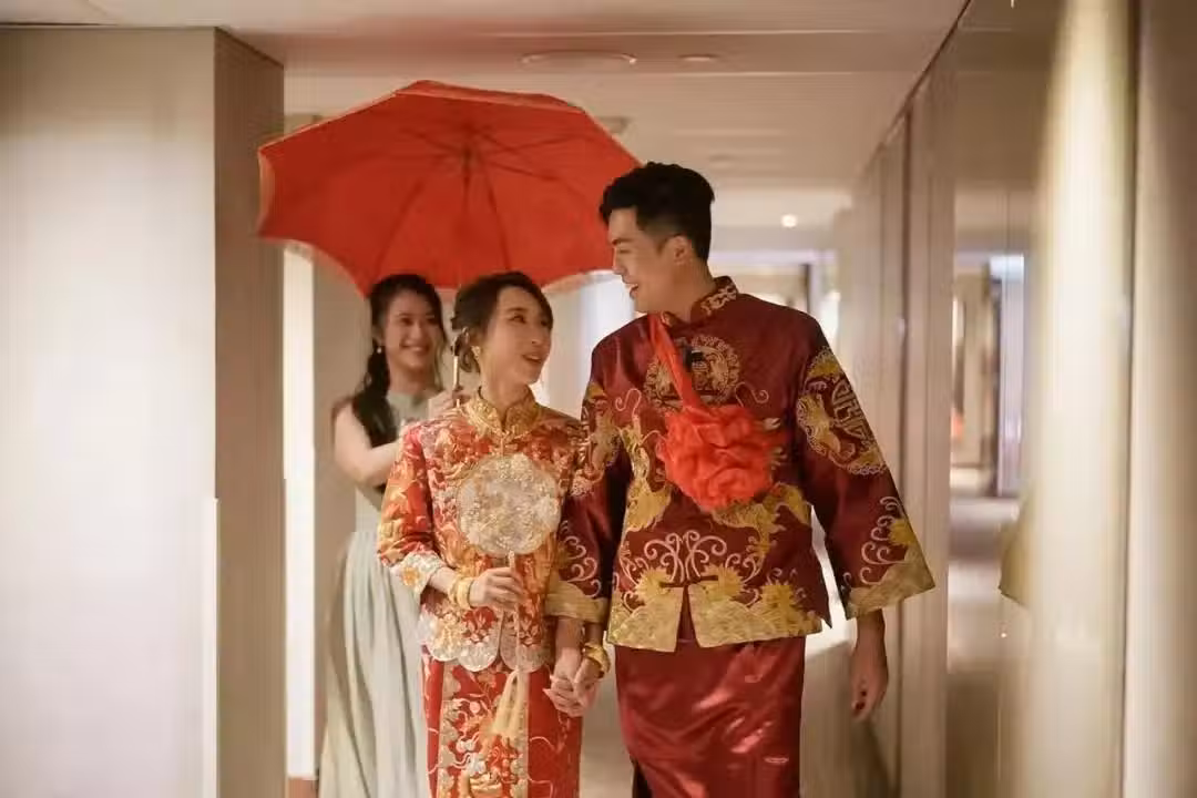 從李嘉晉曬出的婚照看,一對新人依照傳統中式婚禮習俗穿上裙褂,新郎胸前則斜掛著大紅花球,十分喜氣的迎娶新娘。