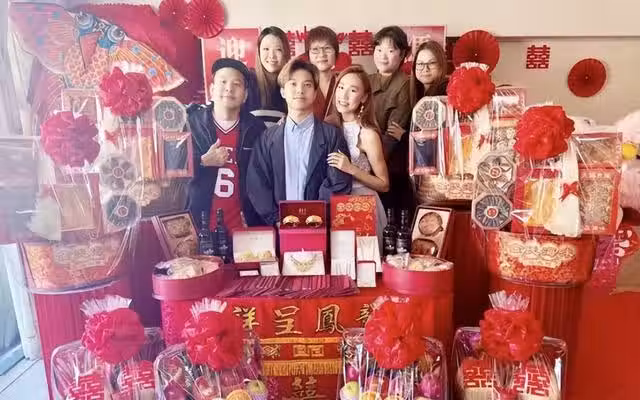 整個大禮過程是婚禮策劃師,教她們怎麼做準備,應該怎麼布置東西,也一直在幫他們怎麼擺放才靚,最終在策劃師的幫助下,才呈現出這麼有排場、也很靚的大禮場面。
