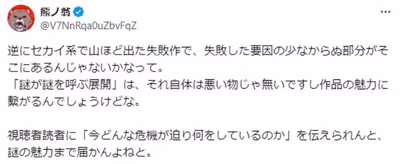 「雖然《新世紀福音戰士》一向以不知所云聞名,但是在作品初期的時候,『糟糕!有大怪獸摧毀了城鎮!趕快推出為了這個時候準備的機器人進行反擊!』這種設定夠淺顯易懂了吧。至於謎團則是放到解謎的部分才會慢慢說明,分得非常清楚,特別是初期的時候。所以才會讓人即便一頭霧水,還是願意看下去。」