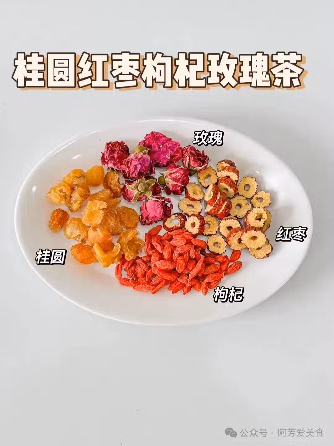 桂圓紅棗枸杞玫瑰,桂圓的軟糯肉質和紅棗搭配,再配上枸杞,還有玫瑰。玫瑰的花香很快就散開了,很好喝。
