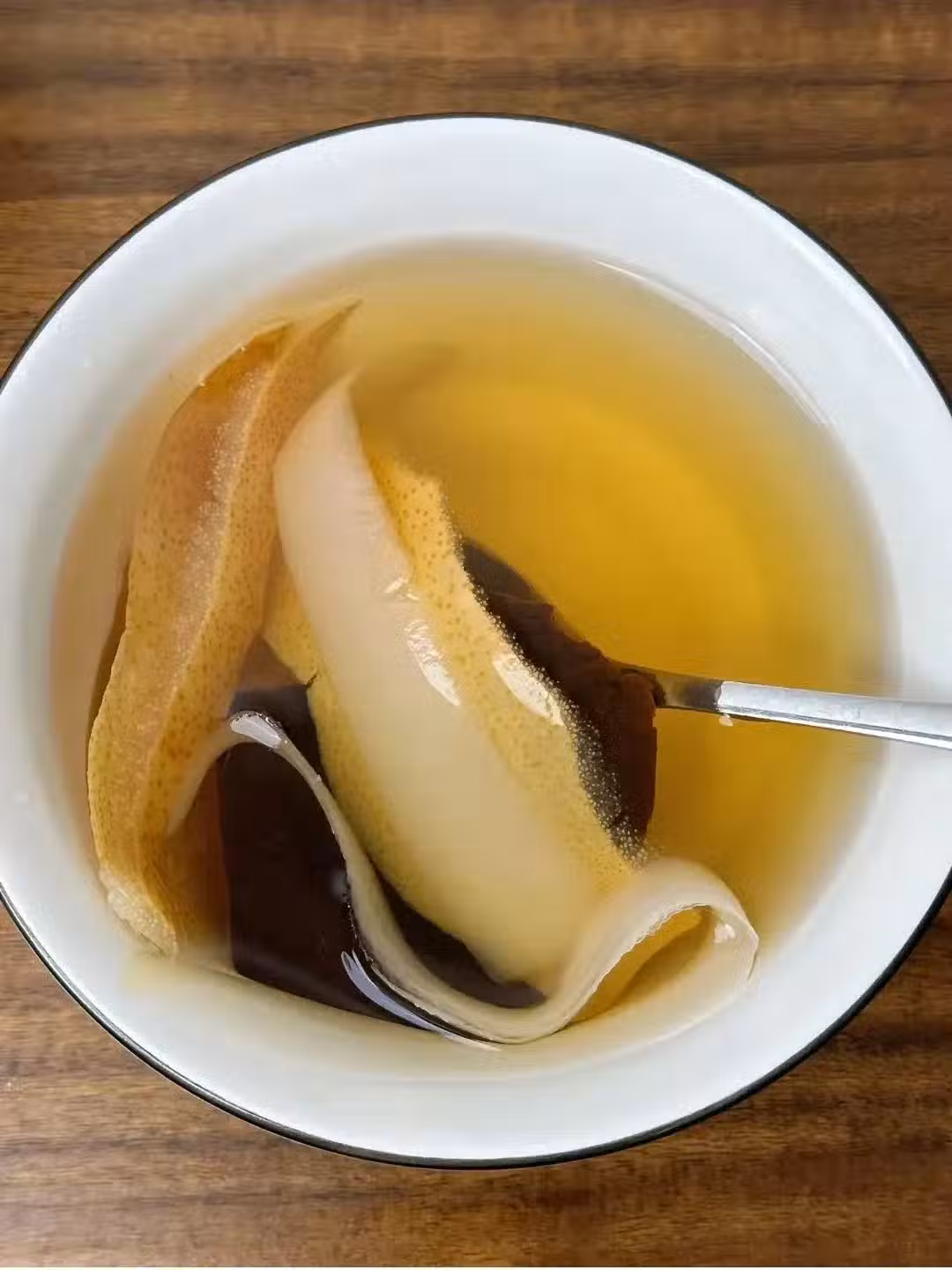 要用雪梨、黃鴨梨的梨皮,不要香梨,同時搭配陳皮理氣化痰平衡梨皮的涼性。蘿蔔皮消食化滯,健脾加強消積順氣,止咳化痰。