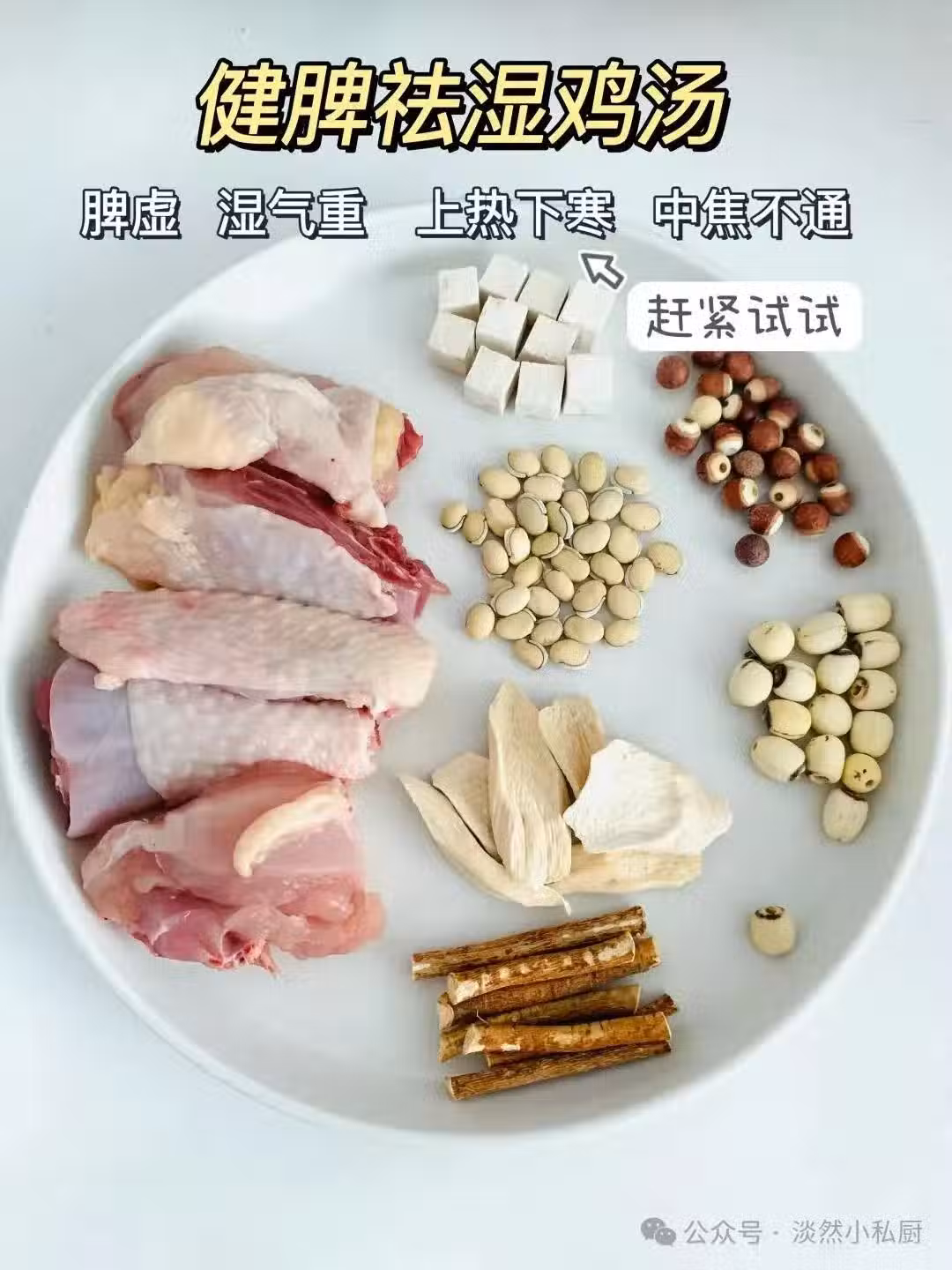 食材:淮山7片、茯苓、蓮子、芡實、五指毛桃、白扁豆各10克,雞半隻,紅棗6顆,生薑枸杞適量