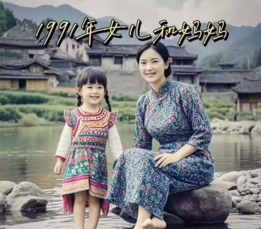 這組照片拍攝的背景是在鄉間的寧靜小河邊,背後是古樸的房屋和青翠的山嶺。1991年,母親帶著年幼的女兒在這裡留下了一張溫馨的合影。照片中的媽媽穿著樸素的傳統長裙,笑容恬靜美好,懷中的女兒梳著可愛的雙馬尾,天真無邪。母女二人當時的合照充滿了生活的氣息,仿佛預示著未來的歲月將會平穩而溫暖地流淌。