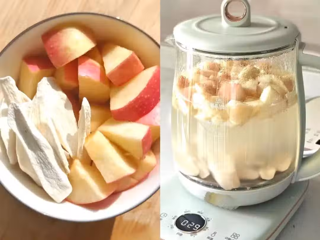 做法:一把山藥干放養生壺先煮40分鐘上下(因為山藥干不易煮爛,所以可以先煮一會);一個不削皮的蘋果用鹽洗凈後切塊放入養生壺一起煮30分鐘左右(嫌麻煩也可以兩個一起放進去煮水。