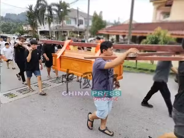 (太平16日訊)茶室少東暈倒不治案,死者陳建良(15歲)今日舉殯,百餘名親友哀傷出席舉殯禮,死者生前參加的新板海南橋雷福宮,11名與死者要好的朋友,更在靈柩前哀唱歌曲《友誼長存》送他走完人生最後一程。