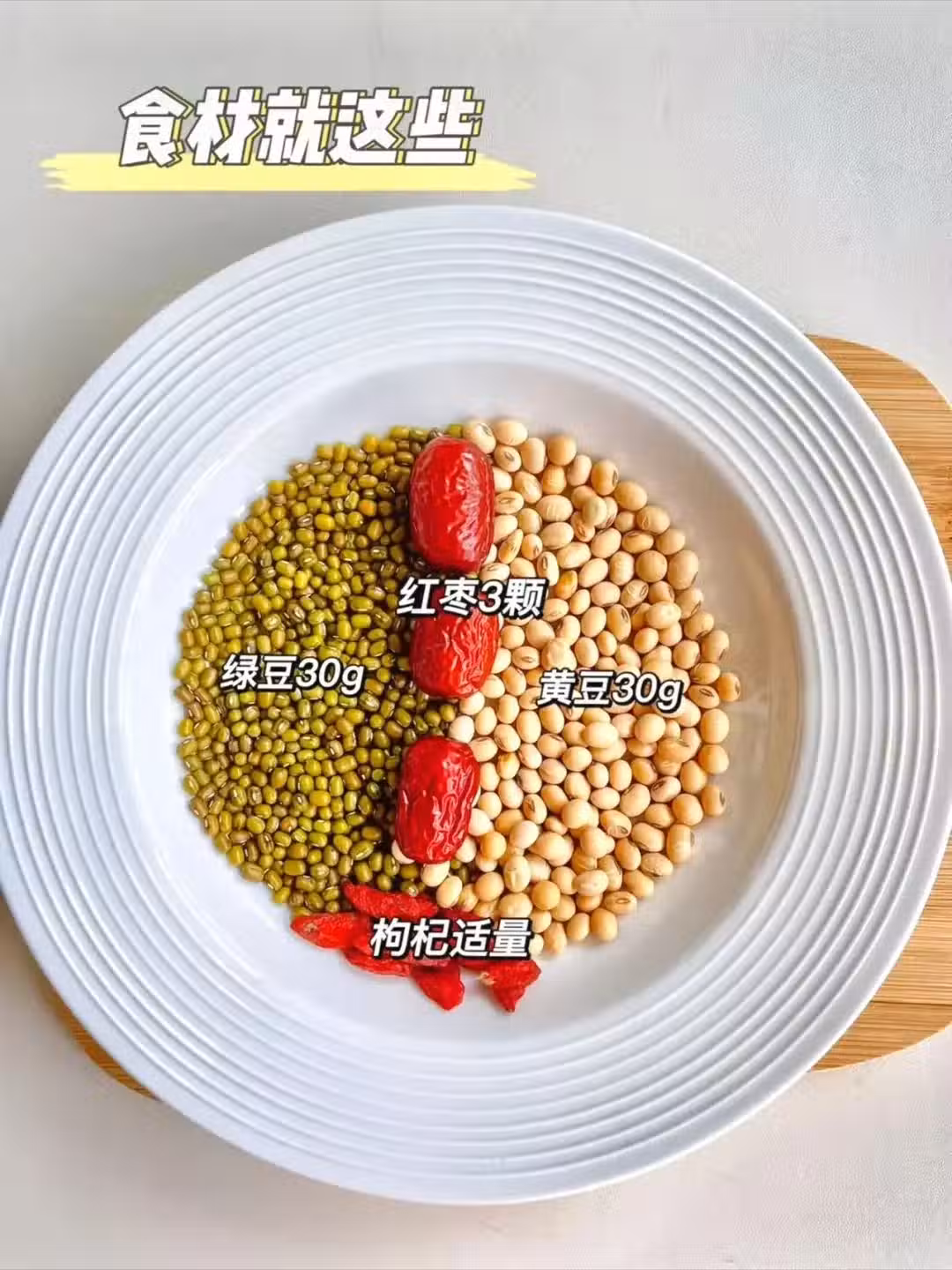 • 準備綠豆 30g、黃豆 30g、紅棗 3 顆(洗凈去核)、枸杞適量。