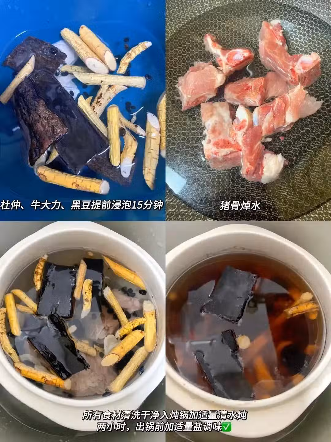 1. 將黑豆、杜仲、牛大力、淮山提前浸泡15分鐘後,清洗乾淨。豬骨進行焯水處理,去除血沫。