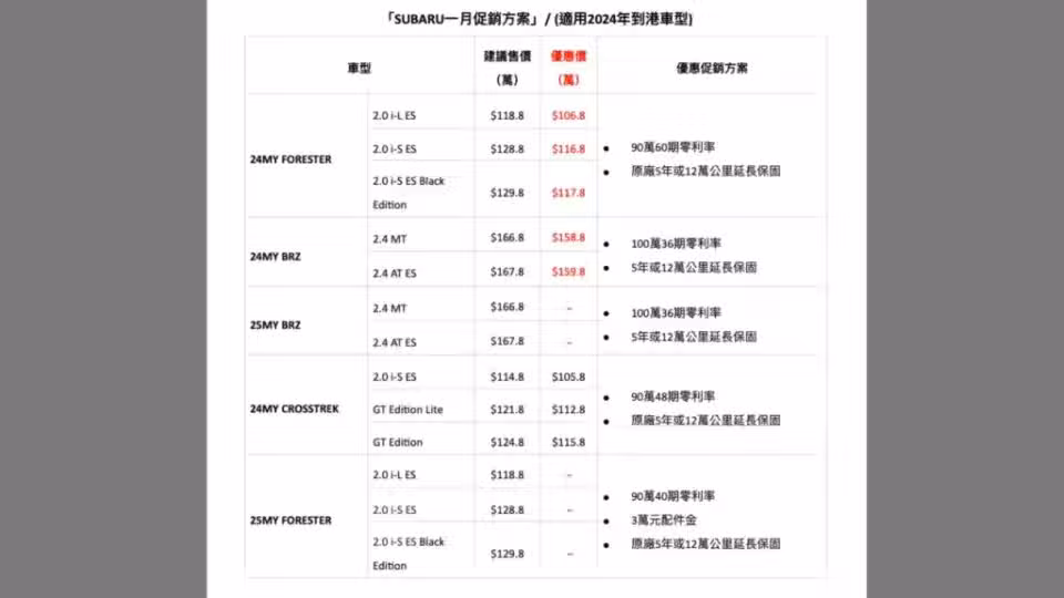 速霸陸1月促銷方案揭曉,25年到港Forester配備升級