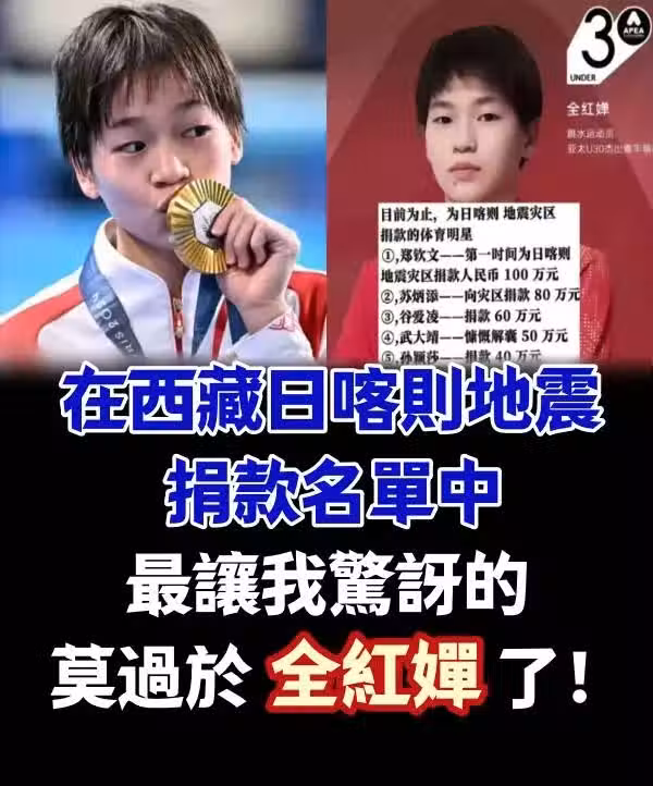 在西藏日喀則地震捐款名單中,最讓我驚訝的莫過於全紅嬋了~!
